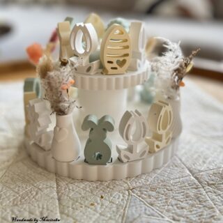Ostern naht und ich habe einiges gegossen aus Gießpulver. Ich benutze meistens Keracraft. Hier habe ich viele kleine Steckfiguren wie Ostereier, kleine Hasen, Blumen und kleine Vasen gegossen. Ich habe auf einen großen Kranz...