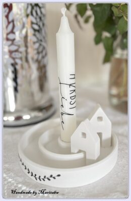 Verschiedene Häuser mit einem Kerzenhalter auf einem runden Teller.
