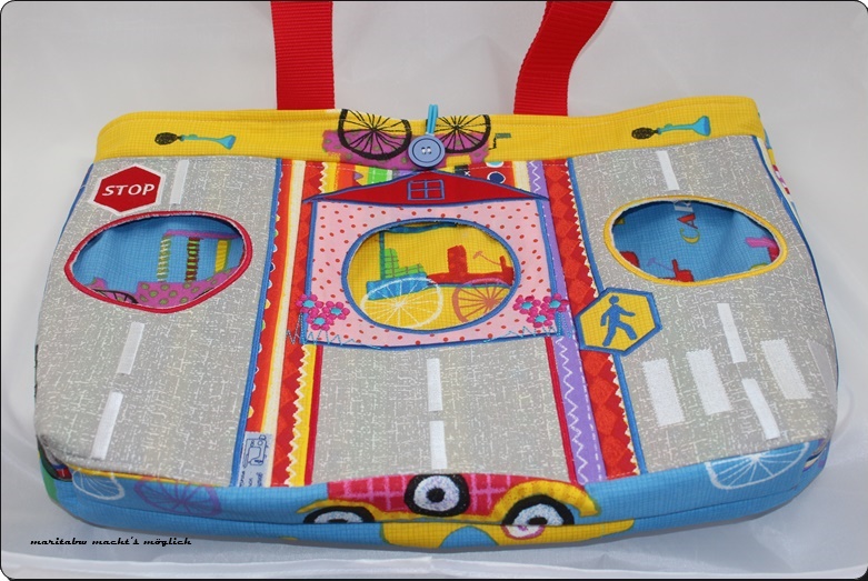 Die Tasche ist zum Teil in der Stickmaschine gestickt, wie z.B. das Vorderteil und die 3 Autos.