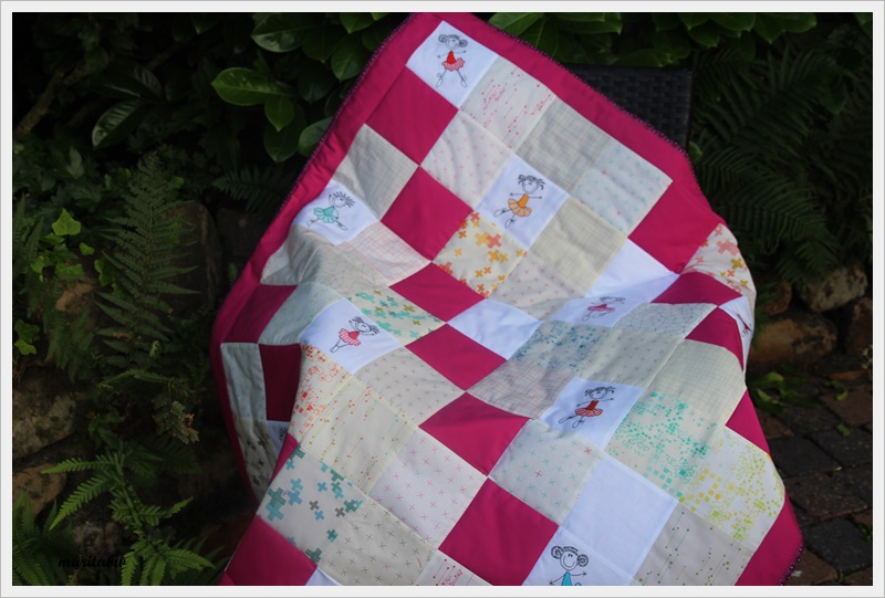 Da ich die kleinen Ballerinas vor einiger Zeit für die liebe Sabine von binimey Probesticken durfte und mir die kleinen Ballerinas so gefallen habe , habe ich zuerst die Ballerinas in verschiedenen Farben gestickt und dann ein Fat Quarter Paket, dass ich mal im Abo von Stoffsalat bekommen habe verwendet. Dann habe ich noch einen kräftigen pinken Stoff dazu genommen für einige Quadrate und als Rückseite.
