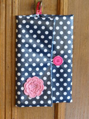 Die kleine Punkte-Clutch ist auch richtig hübsch und das Häkelblümchen ergänzt sie wunderschön!