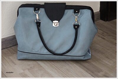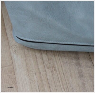 Sie ist aus rauchblauem Kunstleder und die Akkzente sind auch aus schwarzem Leder.