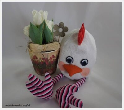 Hier ein gelbes Küken aus einem Fleecestoff. Die Beine und Füße