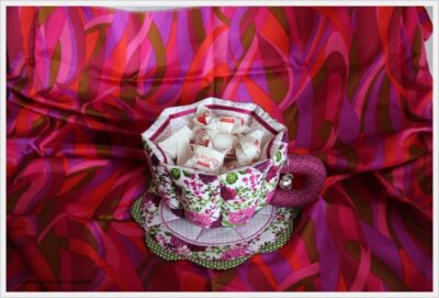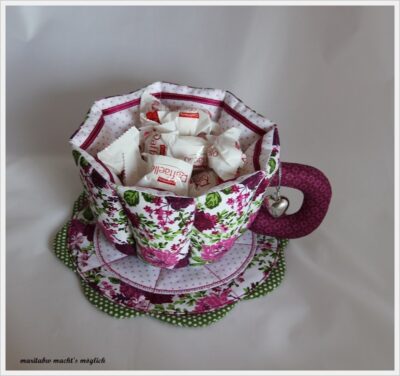 Es ist eine genähte Tasse mit Leckereien gefüllt