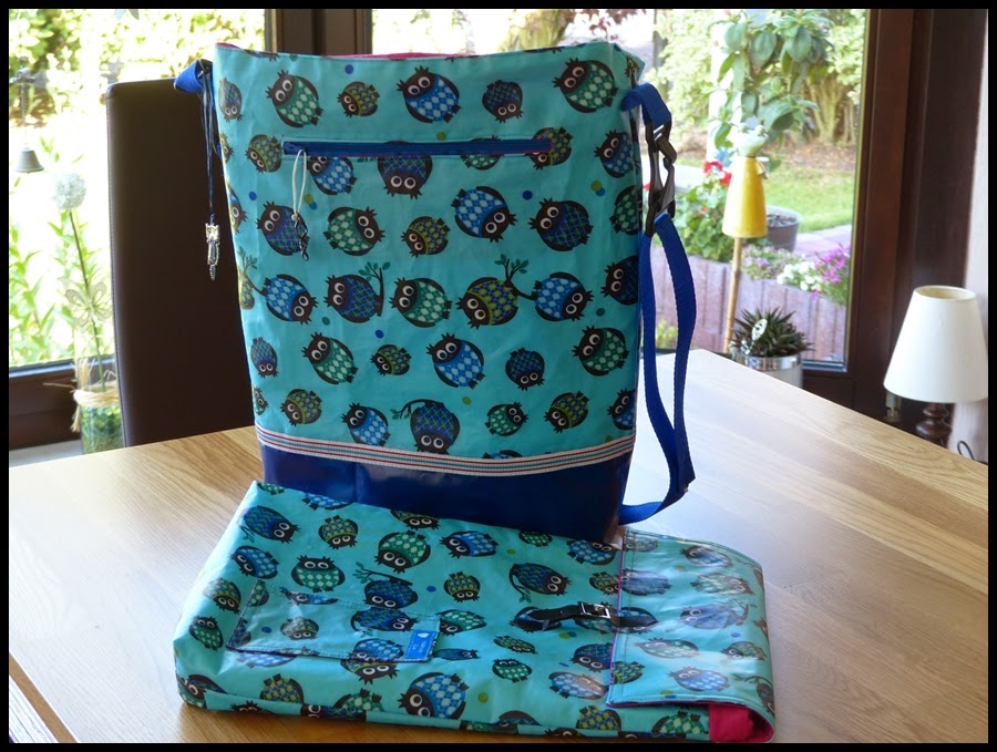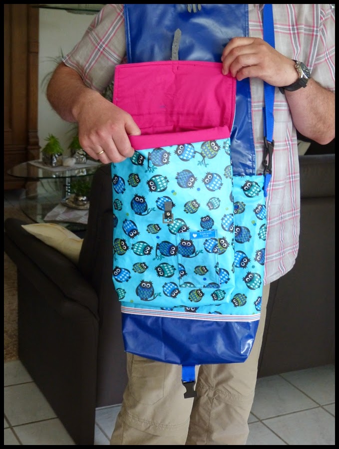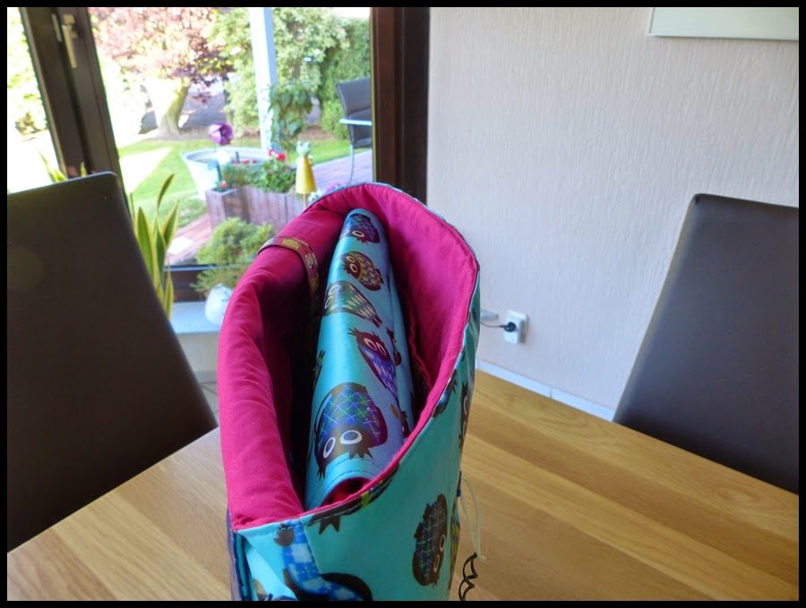 Der Messengerbag ist aus blauem-und Eulenwachstuch genäht und mit Vlies H630 und pinkem Baumwollstoff gefüttert. Er hat viele Innentaschen für Handy , Stifte, Geldbörse und so weiter.