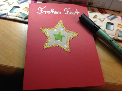 und dann klebe ich ihn in die fertig gestickte Karte ein.