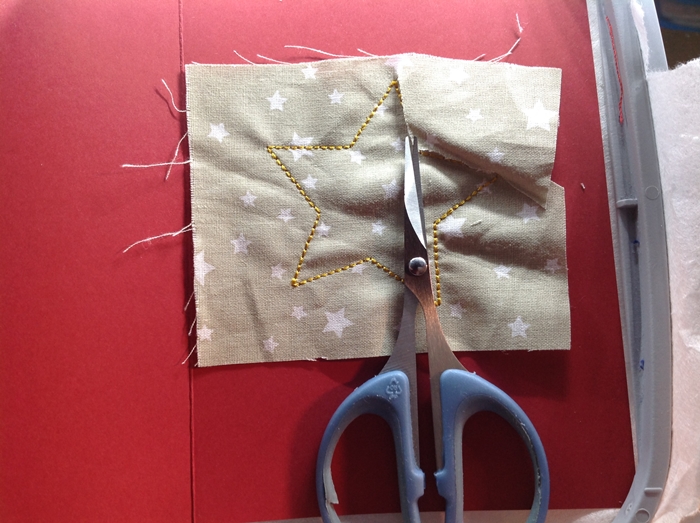 Und anschließend wird von einem Motiv die Umrandung gestickt. Hier zum Beispiel ein Stern.