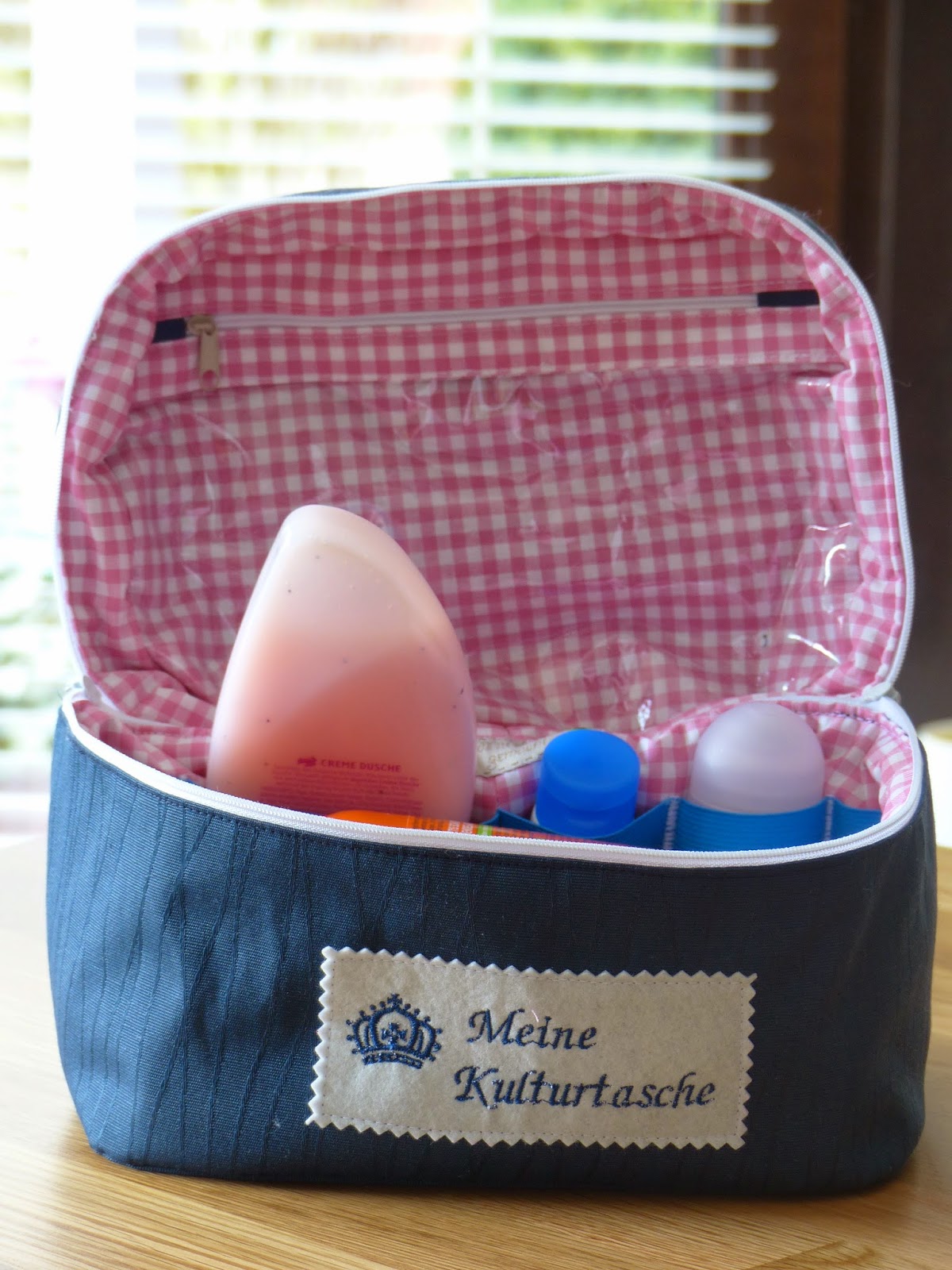Er ist aus blauer beschichteter Baumwolle und innen rosakarierter beschichteter Baumwolle. Da ich für die Innentasche im Deckel keinen Netzstoff hatte, habe ich durchsichtige Folie genommen.