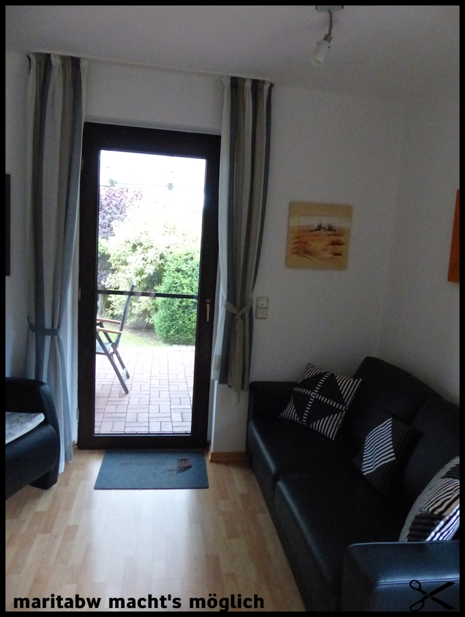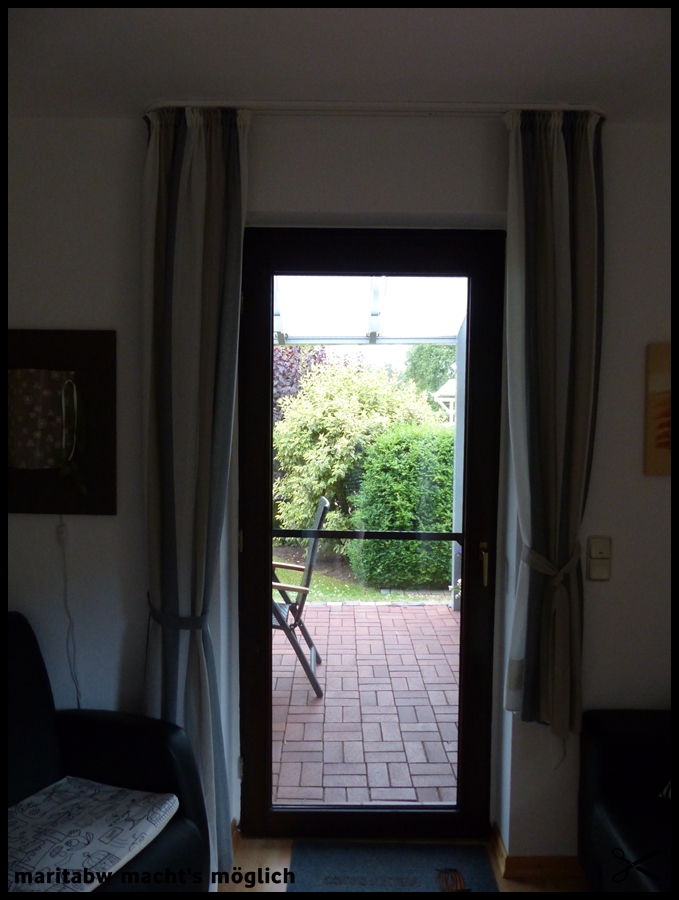 Hier nun die neuen Gardinen in grau-weiß-beige.
