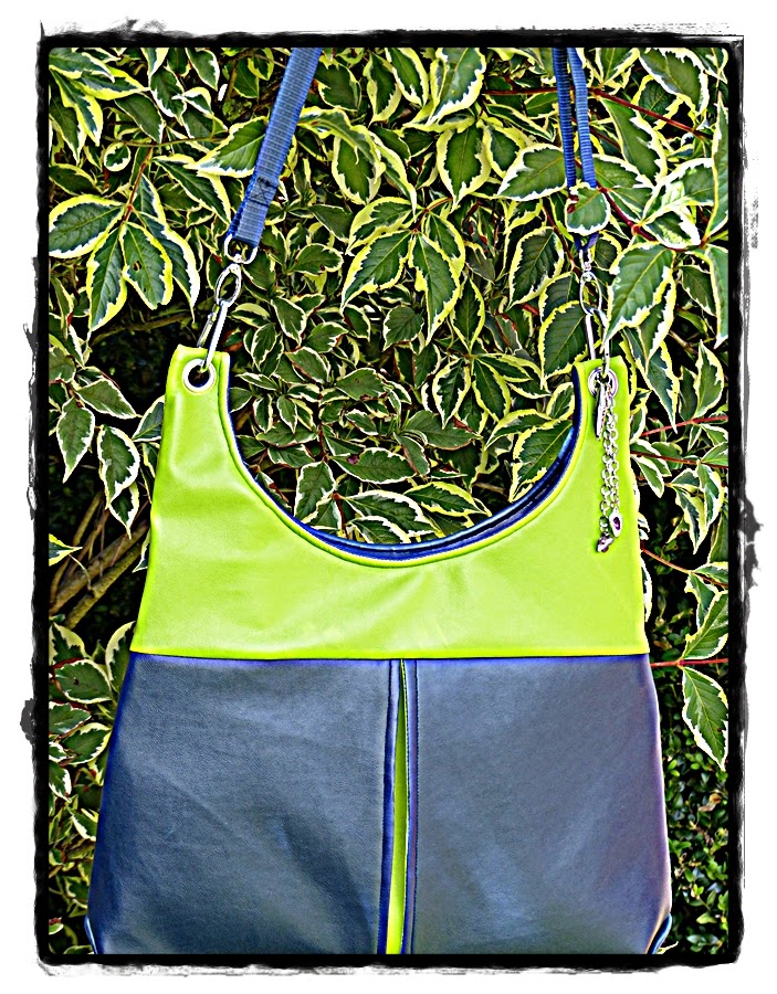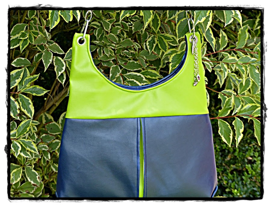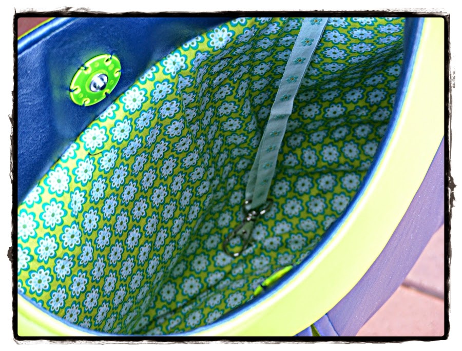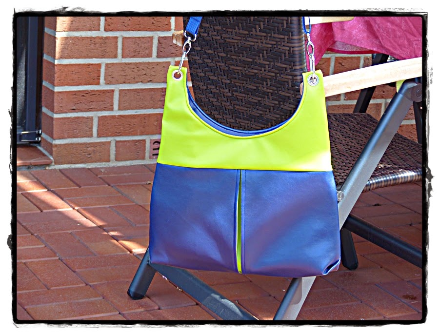 Mir gefiel das blaue und grüne Kunstleder so gut. Davon war noch ein passender Rest vorhanden, so dass ich daraus die „Tasche Eve“ nähen konnte.