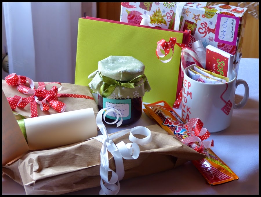 ohhh, wunderschöne geschenke hast du bekommen! find ich schon cool, daß ihr euch gegenseitig bewichtelt habt!!! hahaha! den partnerhandschuh find ich ja soooooo toll, da gibt es doch bestimmt einen schnitt! unsere kinder bekommen meistens geld und das wäre so eine kleinigkeit zum verpacken!!!