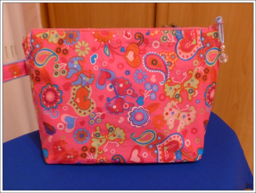 Den Stoff habe ich im hiesigen Stoffgeschäft gekauft und das Wachstuch auf der Creativa. Die Kulturtasche ist mit Thermolam gefüttert, da ich Wachstuch genommen habe, habe ich auf die Einlage verzichtet. Die Schlaufe habe ich mir mit Karabinerhaken am Reisverschluss befestigt, gefiel mir besser als Schlüsselringe.