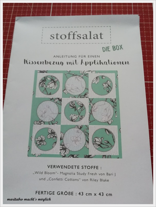 Ich habe mich für dieses Kissen entschieden. Das Material war in der Überraschungsbox vom Stoffsalat , aber ich nähe auch noch ein Kissen aus Resten und das wird ganz bunt.