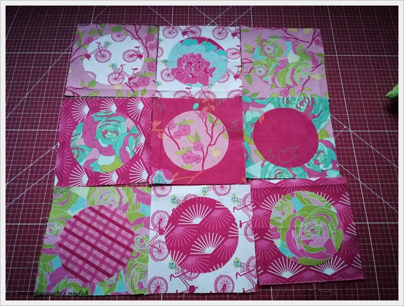 Dafür braucht ihr: 18 Stoffquadrate 5 x 5 inch (1 inch=2,54 cm) Hier sind es 9 weiße und 9 bunte Stoffe. Wer kein Inchlineal hat, kann es in cm umrechnen